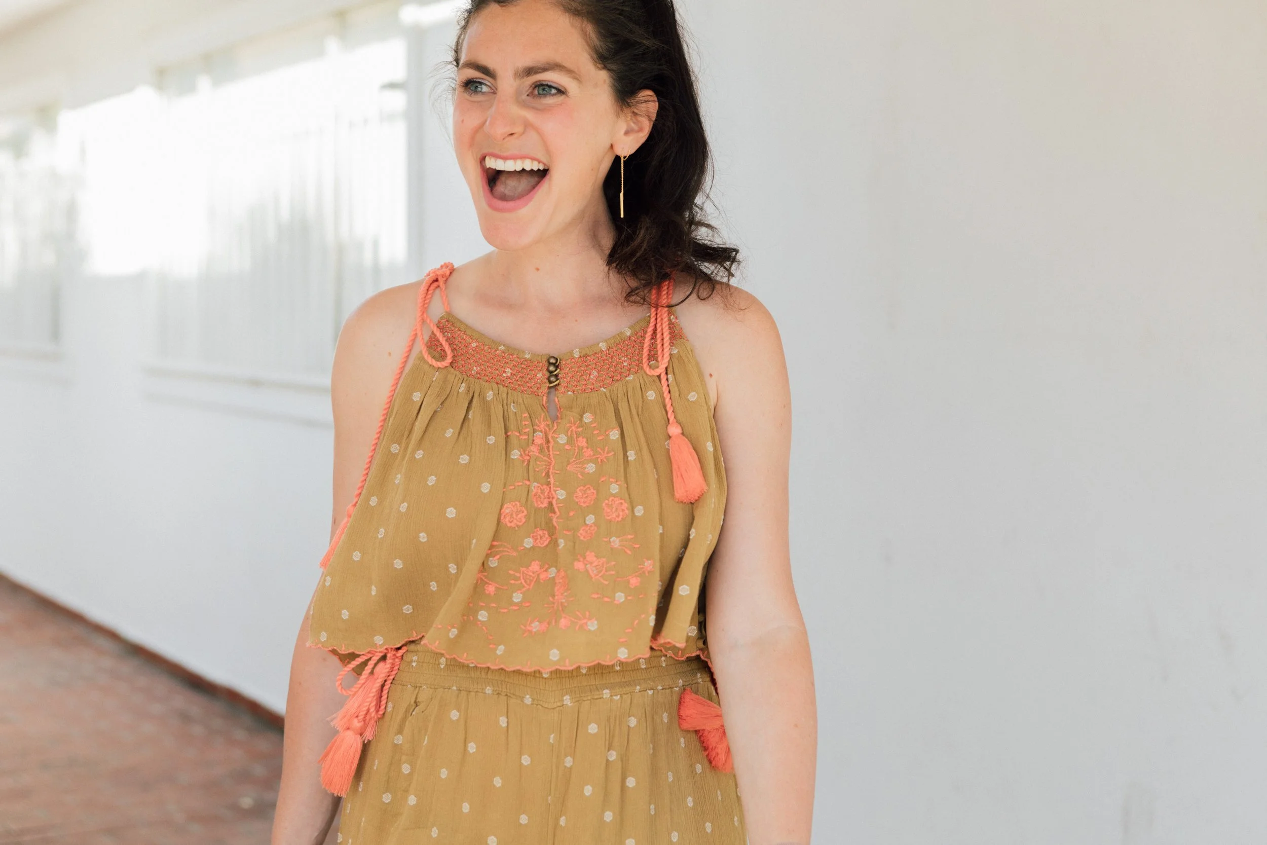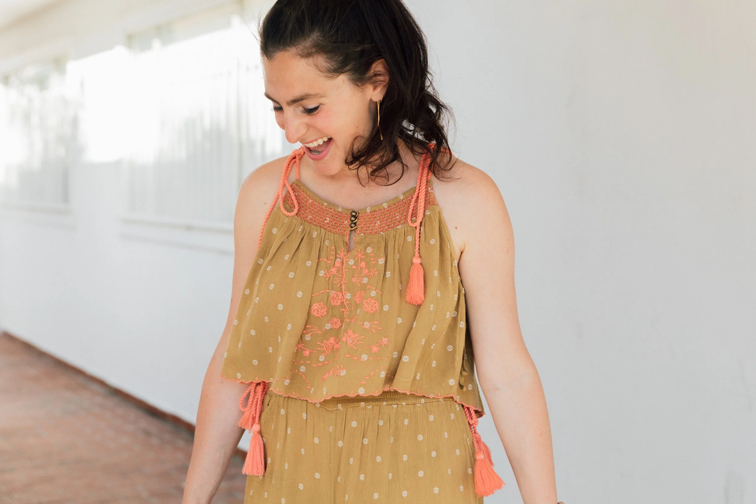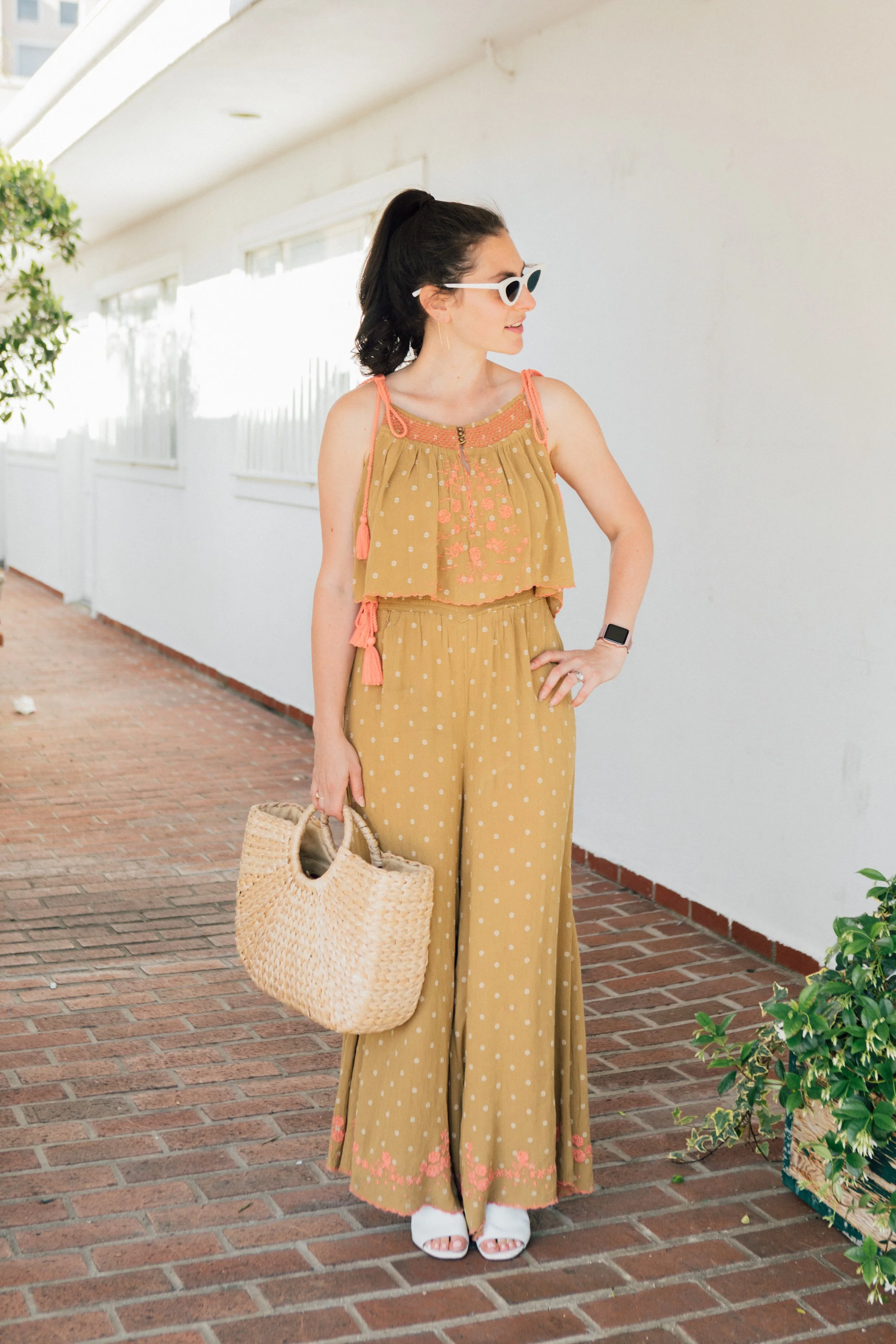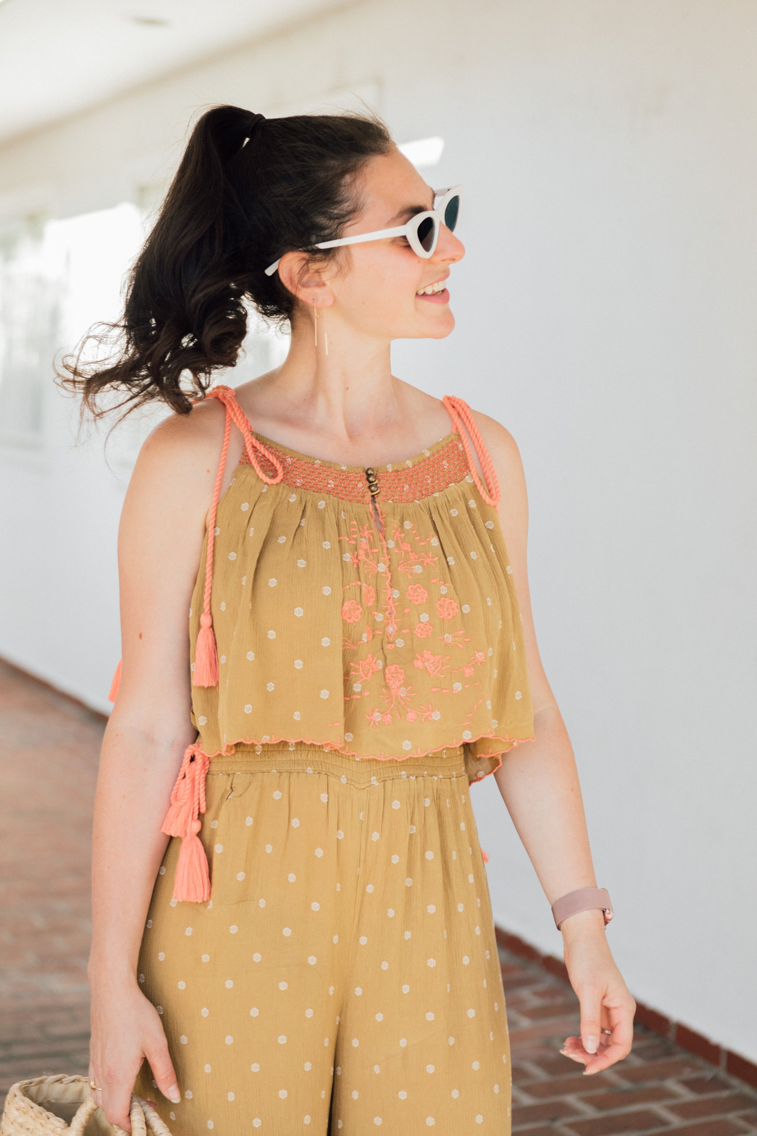 I'm loving the peach embroidery on the top and the adorable tassels and gold accents too. It's the perfect beach day outfit that's also on-point for Netflix and chilling.