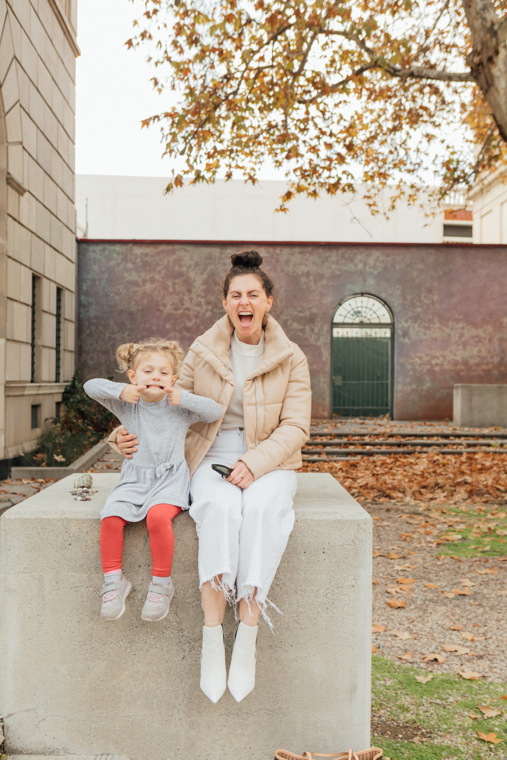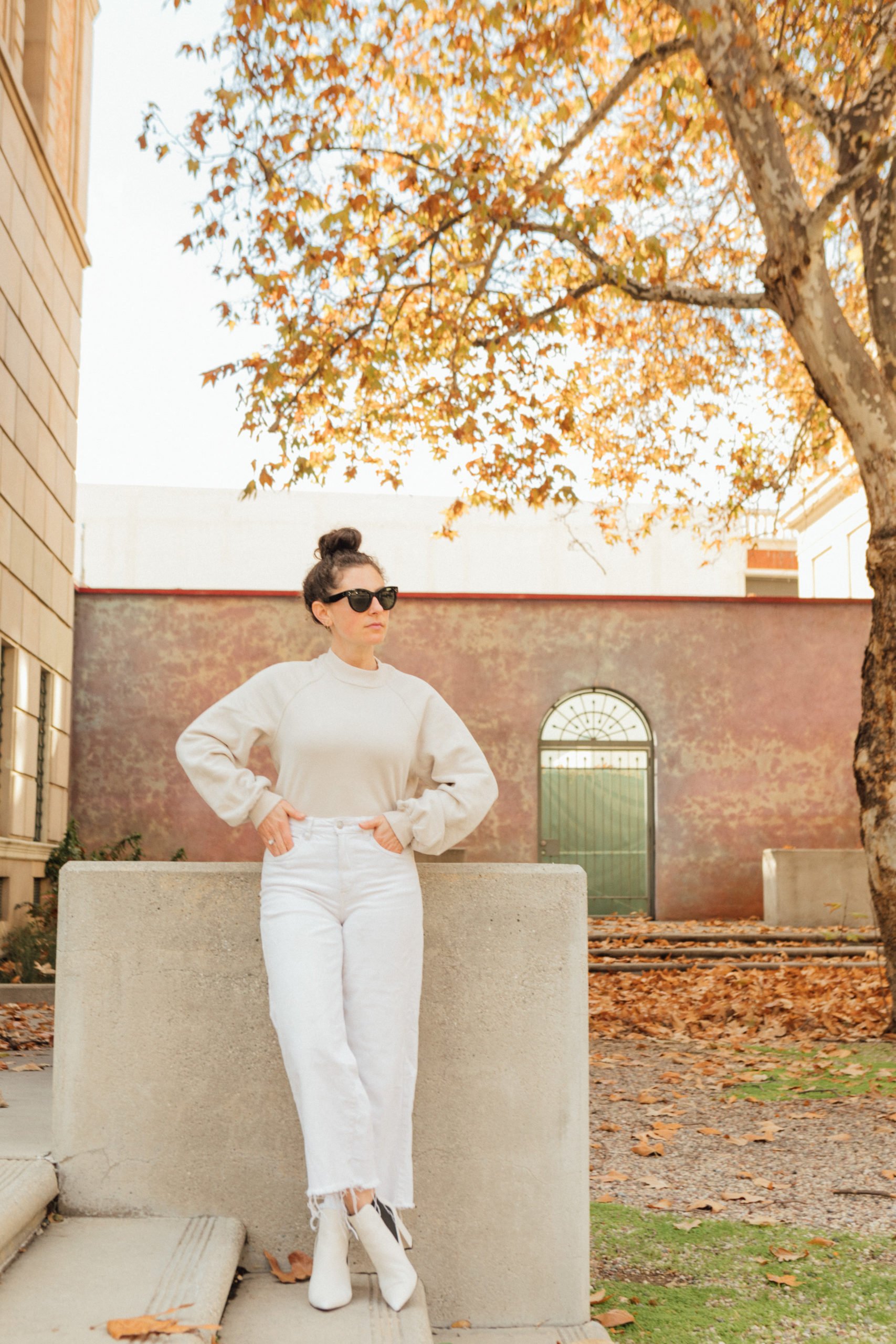 As I shared above, Naiya picked out BOTH of our outfits today. Girlfriend knows what she likes and she's definitely a girl boss in training! She insisted on wearing these red pants for one week straight even though they rarely matched the rest of her outfits. I've learned I'm definitely not the mom who strong-arms Naiya into wearing what I want her to wear--for better or for worse. Sometimes I look back at pictures, though, and I wonder how I let her out of the house in some of her outfit concoctions.Thankfully, she did much better when it came to my outfit today. I love pairing this puffer with light neutrals so basically, Naiya nailed it! (More about my obsession with basic neutrals here). She chose these wide legged white pants, basic mock neck sweatshirt, white booties and classic sunnies.