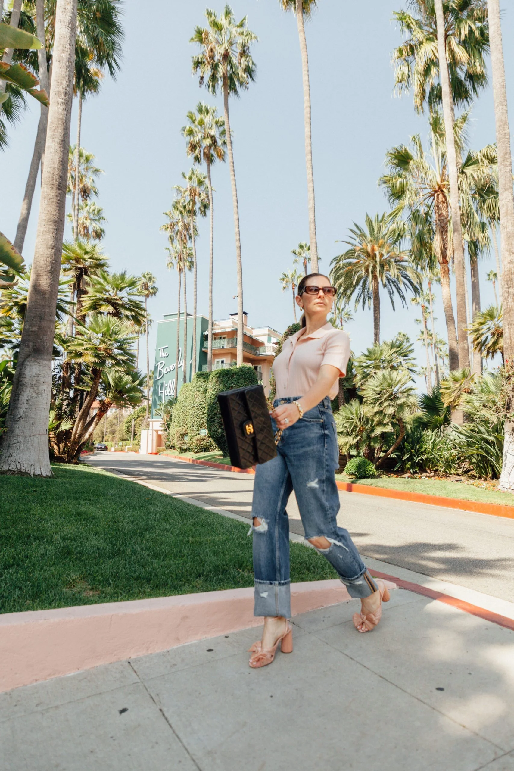 Today, I paired a blush pink button down top with these jeans. I accessorized with pink feminine heels with a bow, 90's-inspired sunnies, gold vintage hoops, a vintage chanel bag, and I added a bow in my hair. I've been all about classic, feminine looks recently--especially after a year of quarantine.