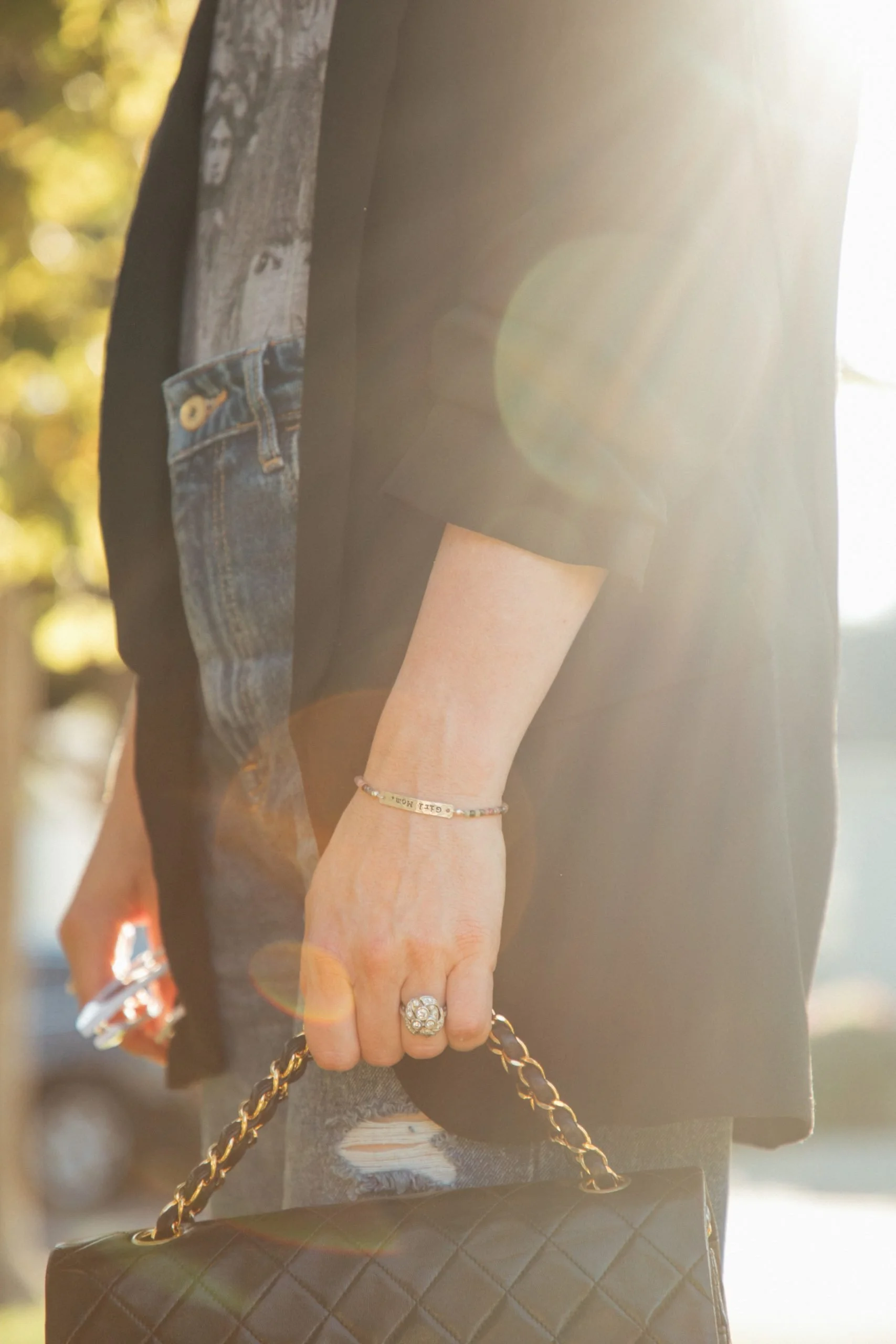 Also sharing where to snag a look I've been wearing on repeat for fall: wide leg distressed denim, band tees ($15--you can't go wrong!), comfy blazers and oversized white sunnies. I topped off my look today with a handmade, personalized bracelet by a friend of mine from elementary school. She's a mama who started her own jewelry business called Eunoia Designs. My bracelet has become a wardrobe staple because it goes with everything. I had her engrave "girl mom" on it but she can add anything you may have in mind! They're the perfect holiday gifts or gifts for new mamas!
