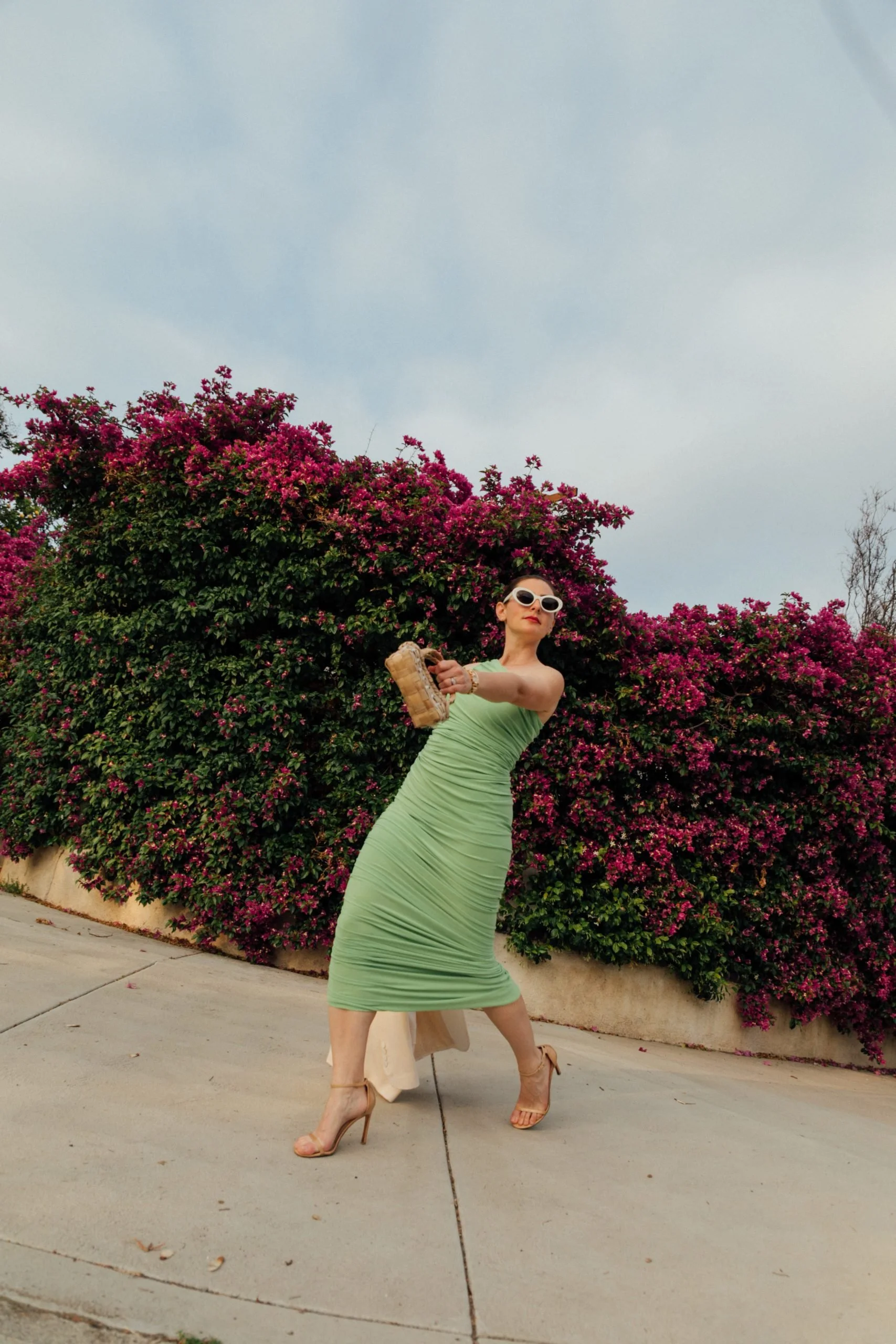 Today, I layered this bright green Norma Kamali dress beneath a classic white oversized blazer (similar here), neutral sandals, white cat eye sunnies, and a neutral purse I scooped up in Bora Bora (more here). It's called the "Diana Gown" and it's so chic in person. The material is soft and flattering on a number of different body types.It's important to note that this dress has a built-in leotard. If you do not position the dress in the right way, you can potentially see visible lines from the leotard.