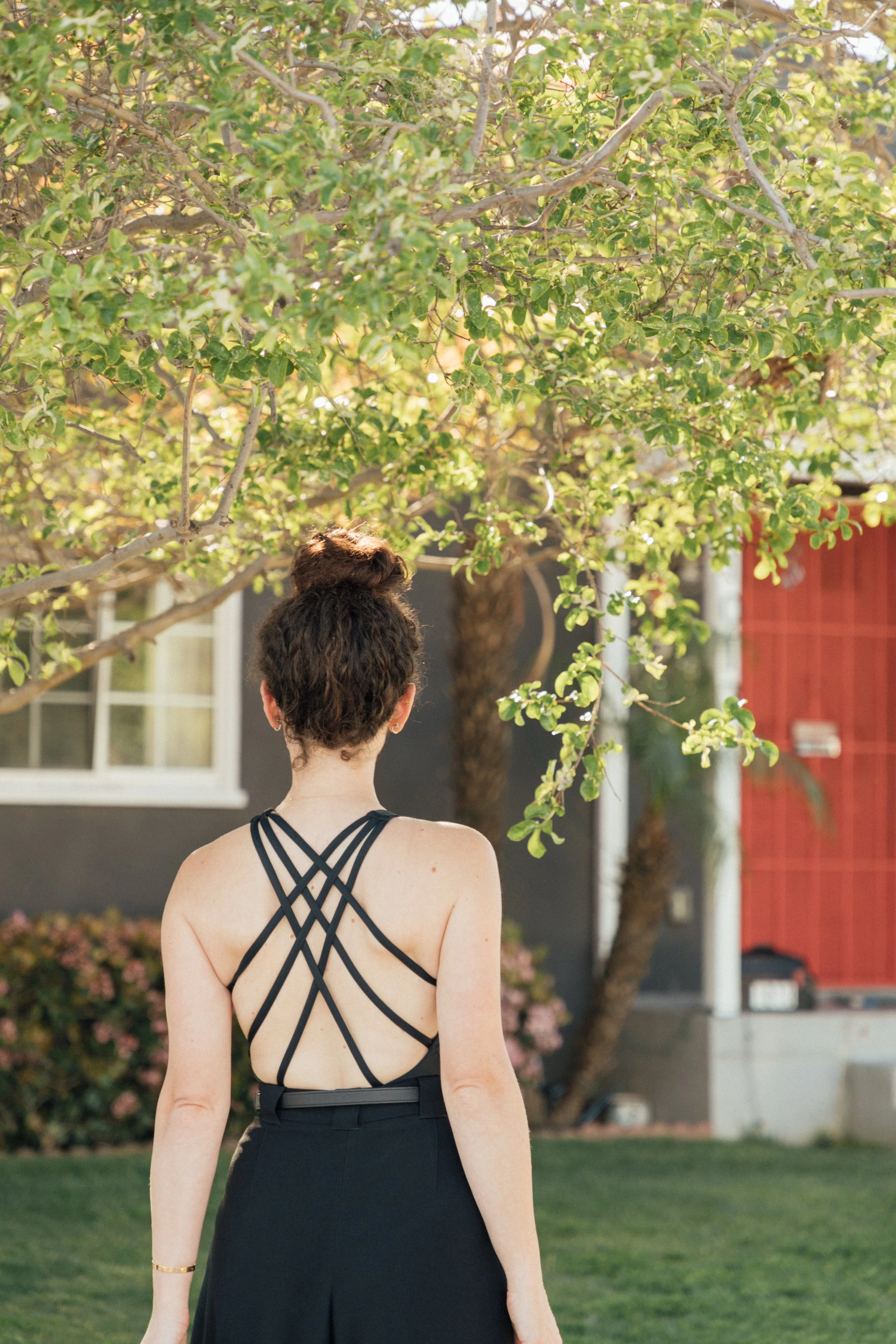 I’ve become quite the fan of wearing swimsuits all year round as body suits and this one does not disappoint. I’m loving this black one piece suit by Bromelia which has the prettiest crisscross back. Today, I paired it with the comfiest, classic trousers and this chic black blazer. I topped off the look with a classic bag, pumps, and gold sunnies. Shop this look by clicking the links below.
