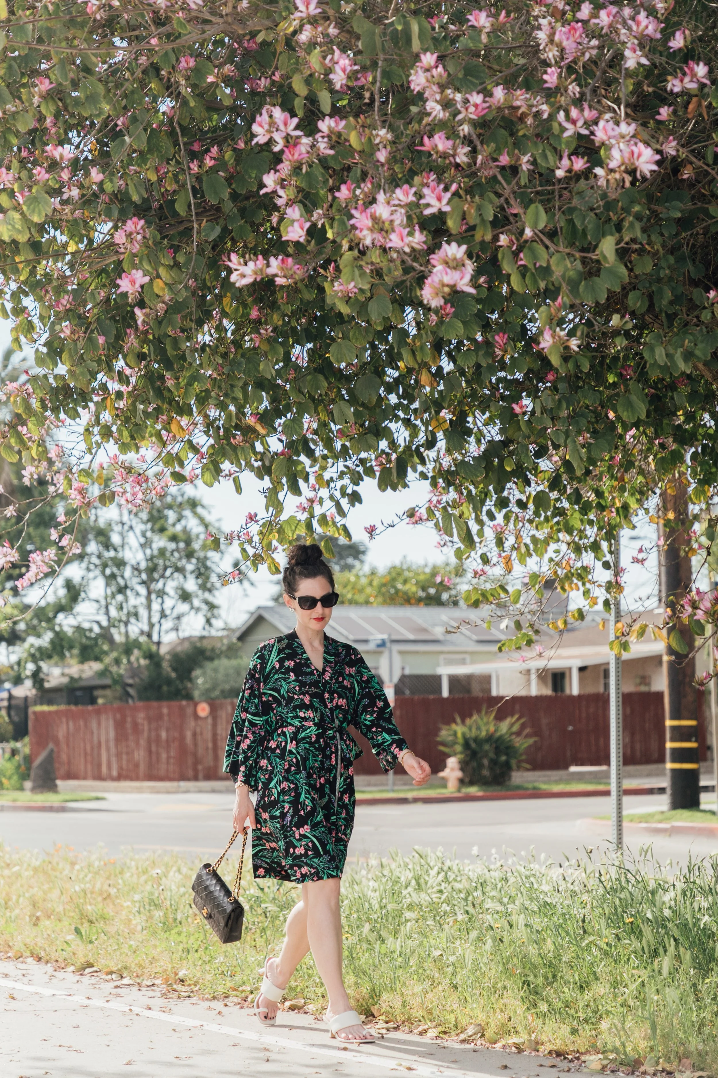 I believe it’s meant to be more of a lingerie set—a slip dress with a matching robe. That said, it’s really fun and versatile, and the print is giving floral vintage vibes. I paired it with some vintage-inspired accessories—Chanel sunnies with pearls down the sides, crystal “crawler” earrings, a classic bag, and white sandals. Looking back now, I made the look overly extra but it was definitely a vibe.