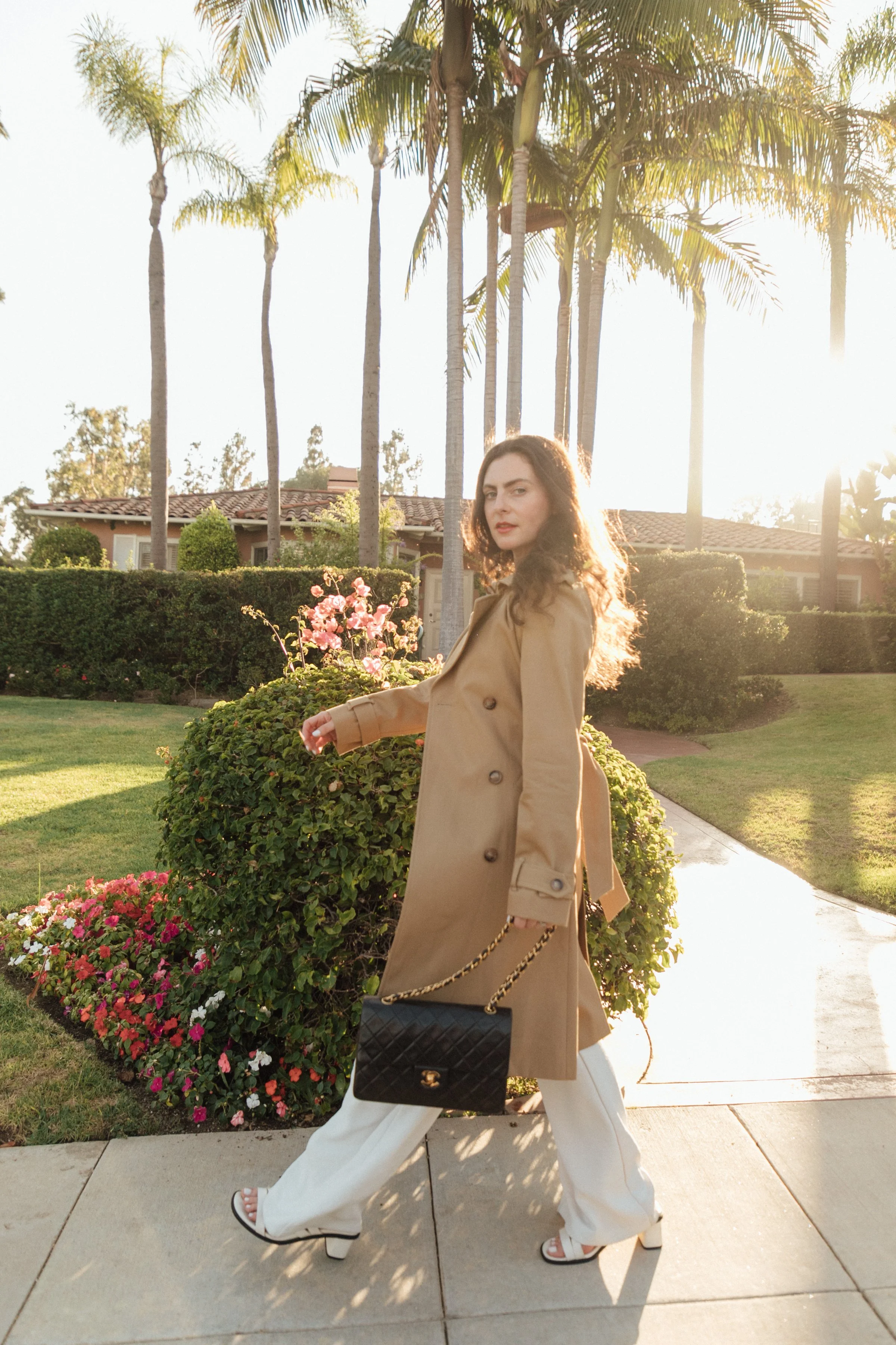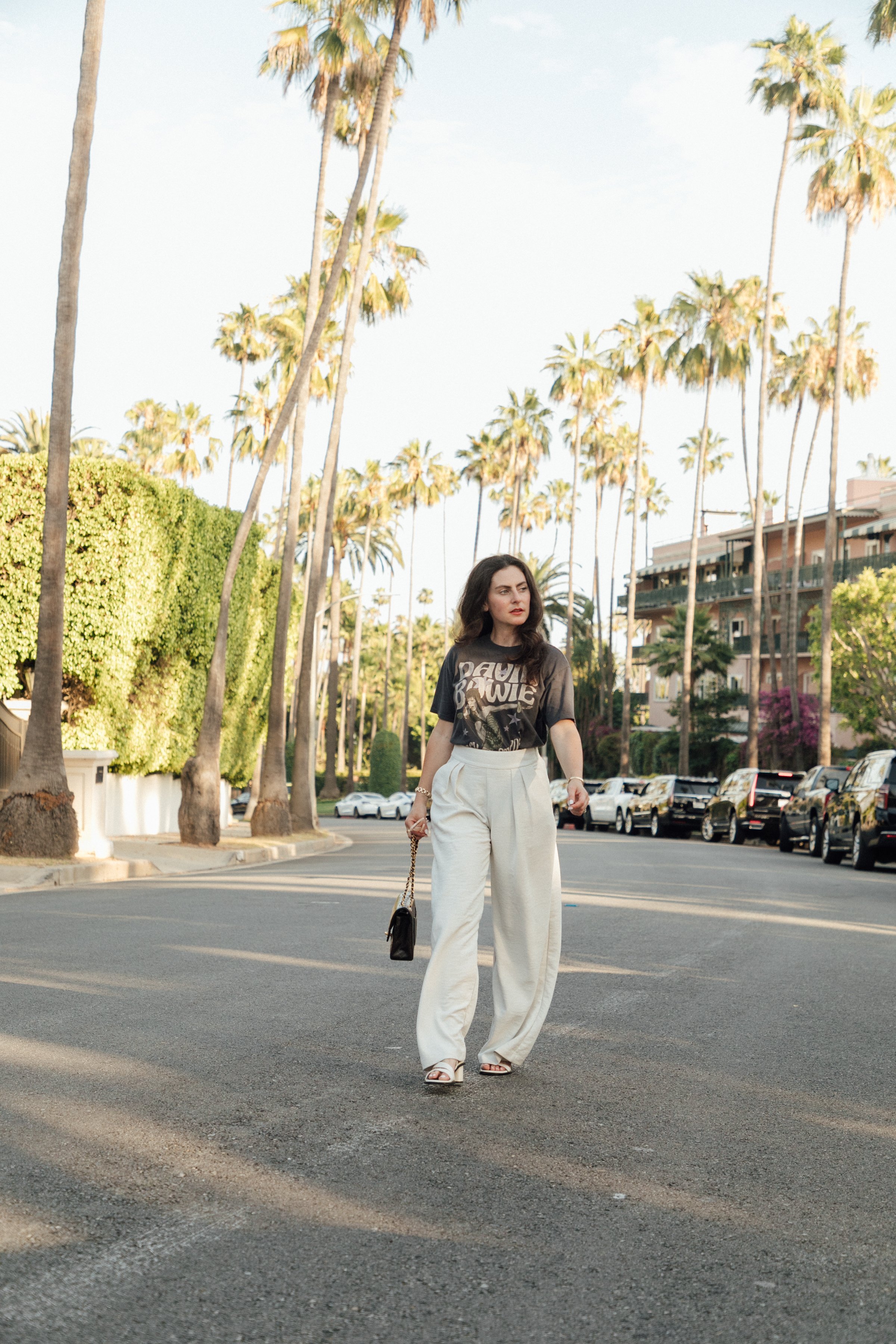 Today, I’m sharing how I styled a David Bowie band tee with white wide leg pants. From there, I layered on a classic trench. The trench adds a totally different vibe to the look which I also love. I’ll be wearing this type of outfit on repeat this fall.