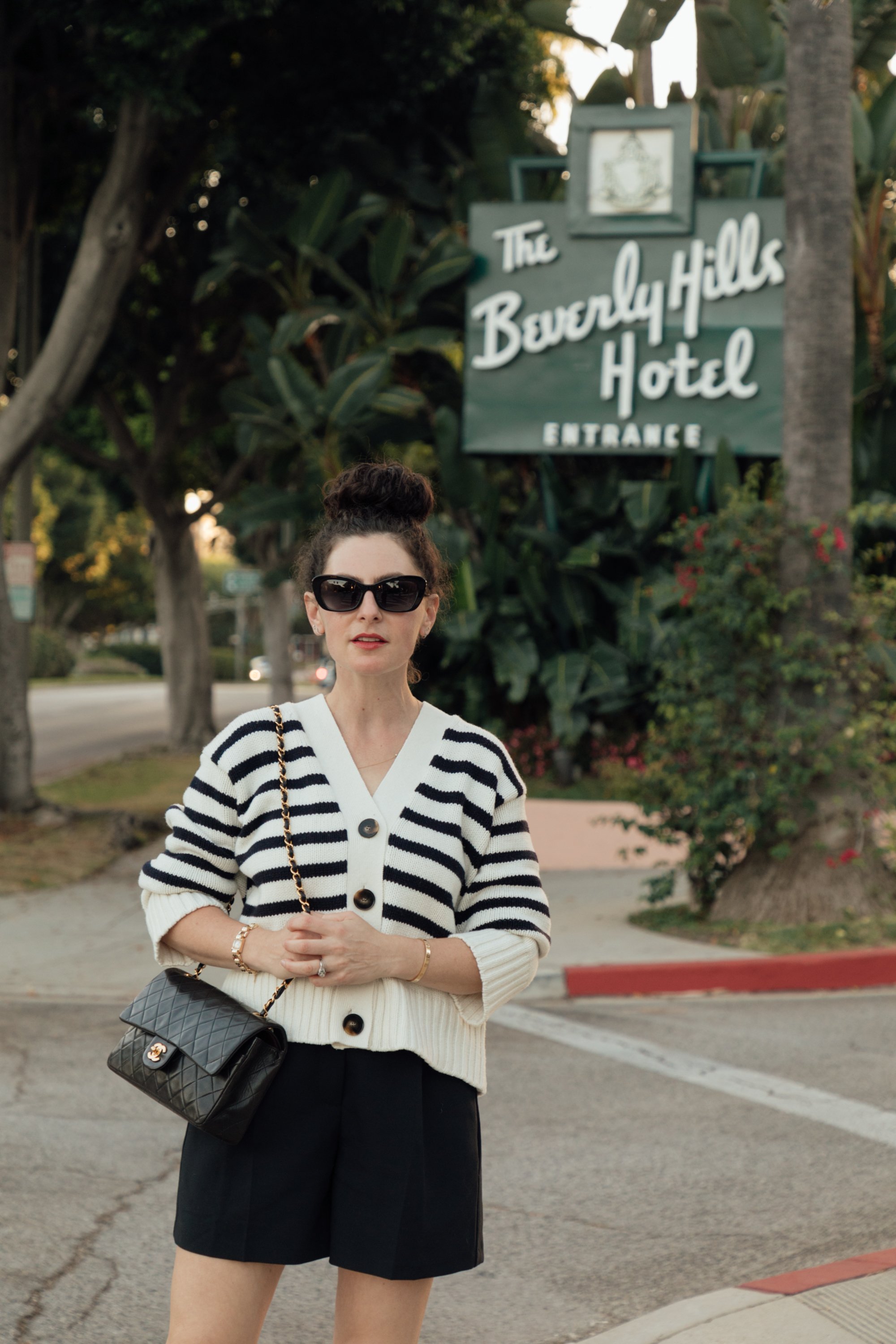 As a forever fan of French-inspired fashion, this look makes my heart happy. You can’t go wrong with black and white stripes and classic pieces—they’re truly timeless. Today, I paired a black and white striped cardigan with black tailored shorts, classic pumps, and a classic bag. I topped off the look with one of my fave pairs of black sunnies of all time: Chanel cat eye glasses with pearls down the sides (clickable links below).