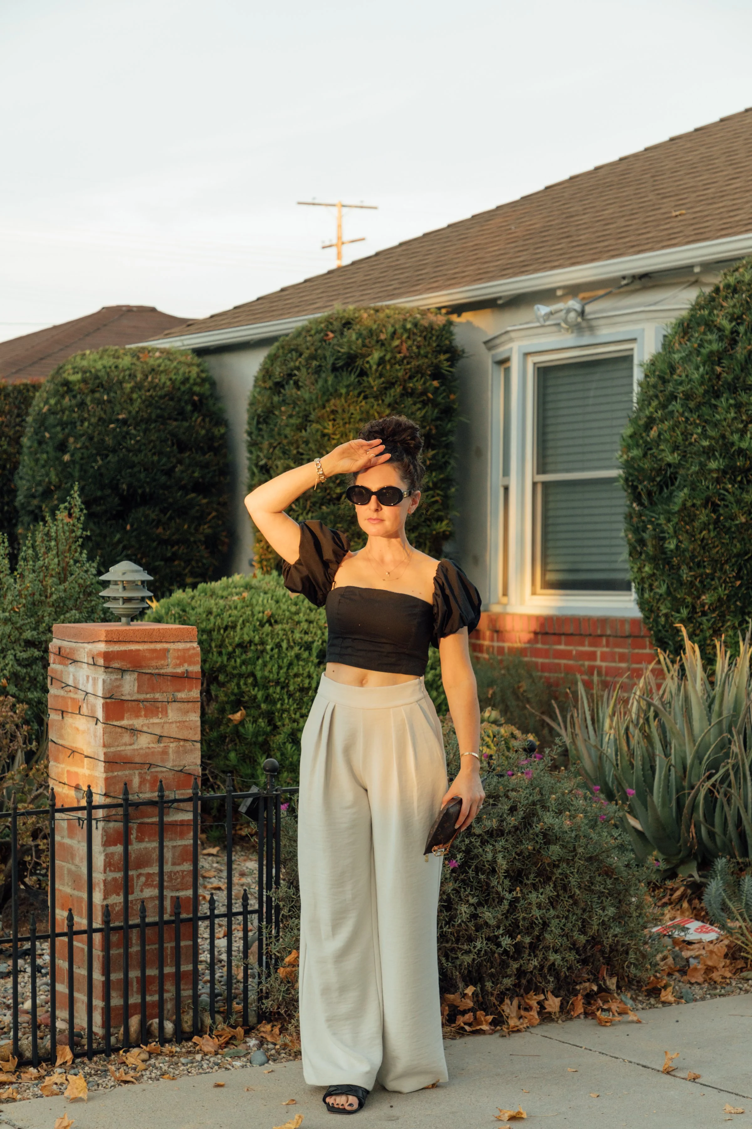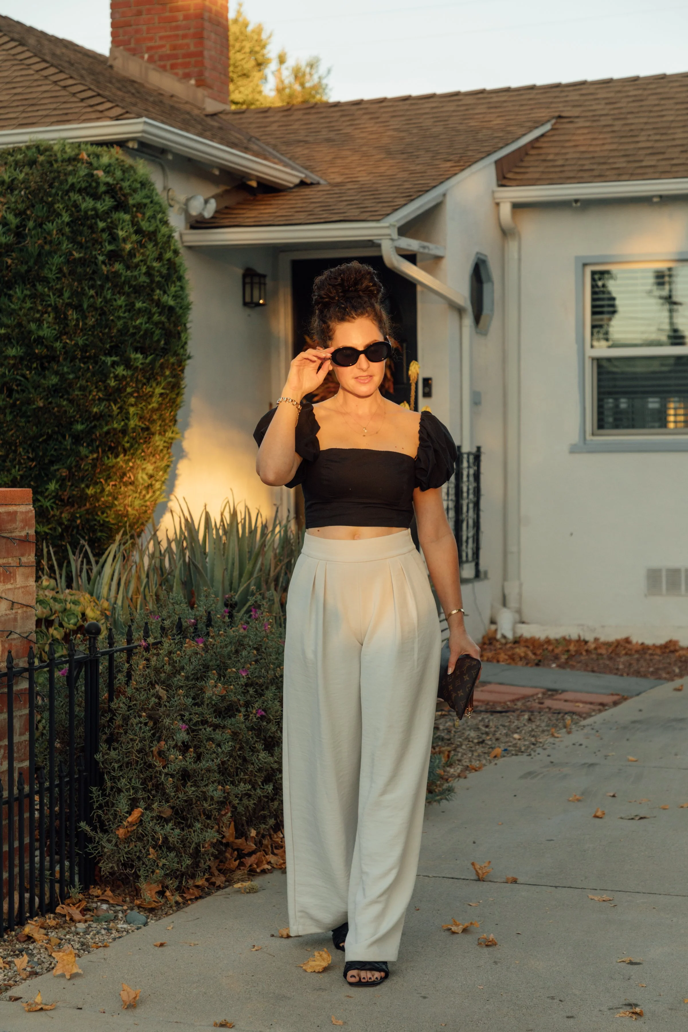 If you’re on the hunt for an affordable, versatile top for holiday parties this season, I’m loving this black off-the-shoulder crop-top. Today, I paired it with white wide leg trousers but it looks equally great with black trousers or with colorful skirts like this one here. I love the puffy sleeves. I topped off today’s look with black woven sandals, classic black sunnies, and a clutch.