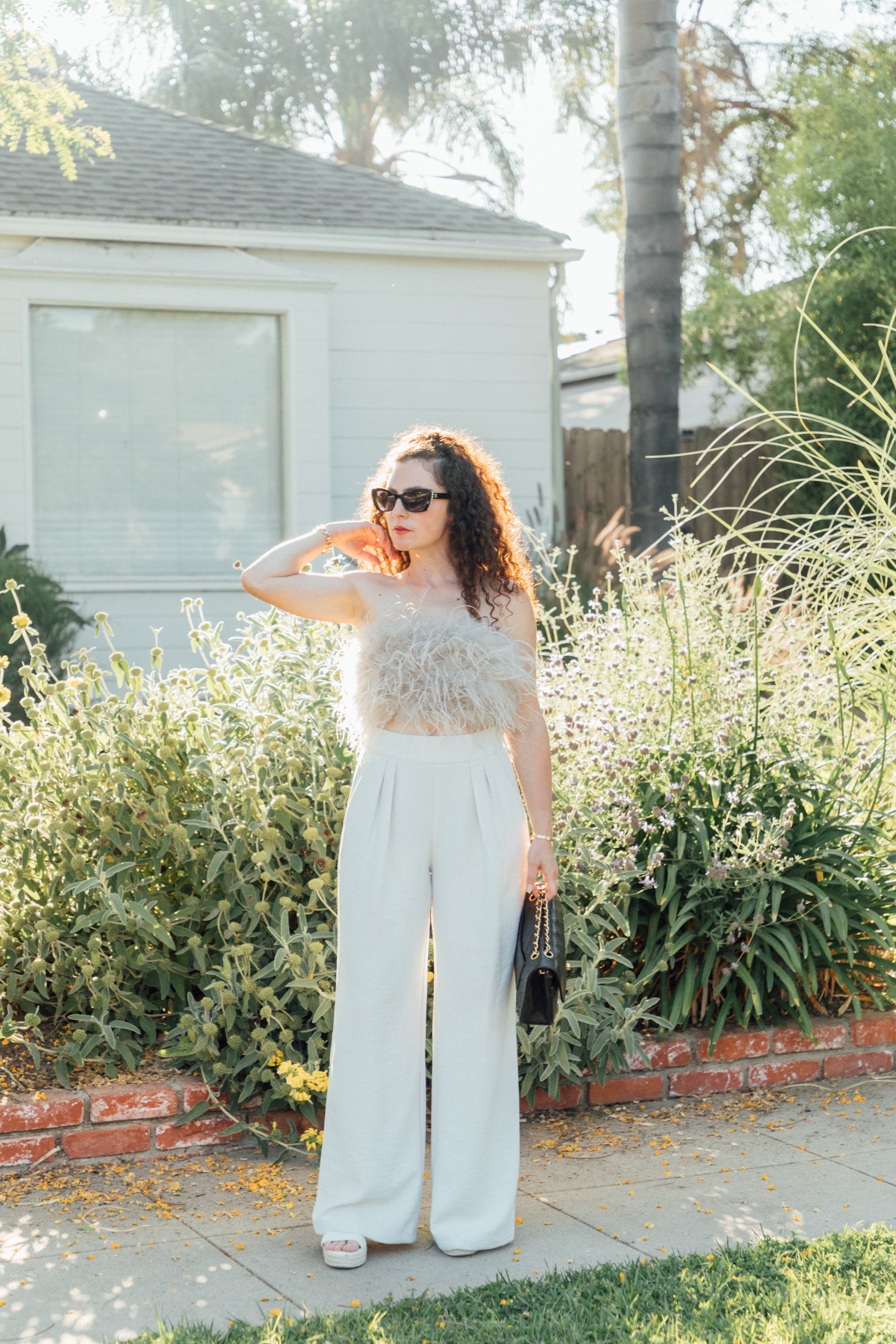 I initially scooped up this feather top for a trip to Vegas a few months back but I’ve also found some fun ways to style it for nights out here in LA too. Today, I paired it with wide leg white trousers, a classic Chanel bag and sunnies. I can’t rave about this top more. It’s comfortable and so fun to style. It looks great underneath an oversized blazer and comes in a number of different colors. Linking to some of my faves below.