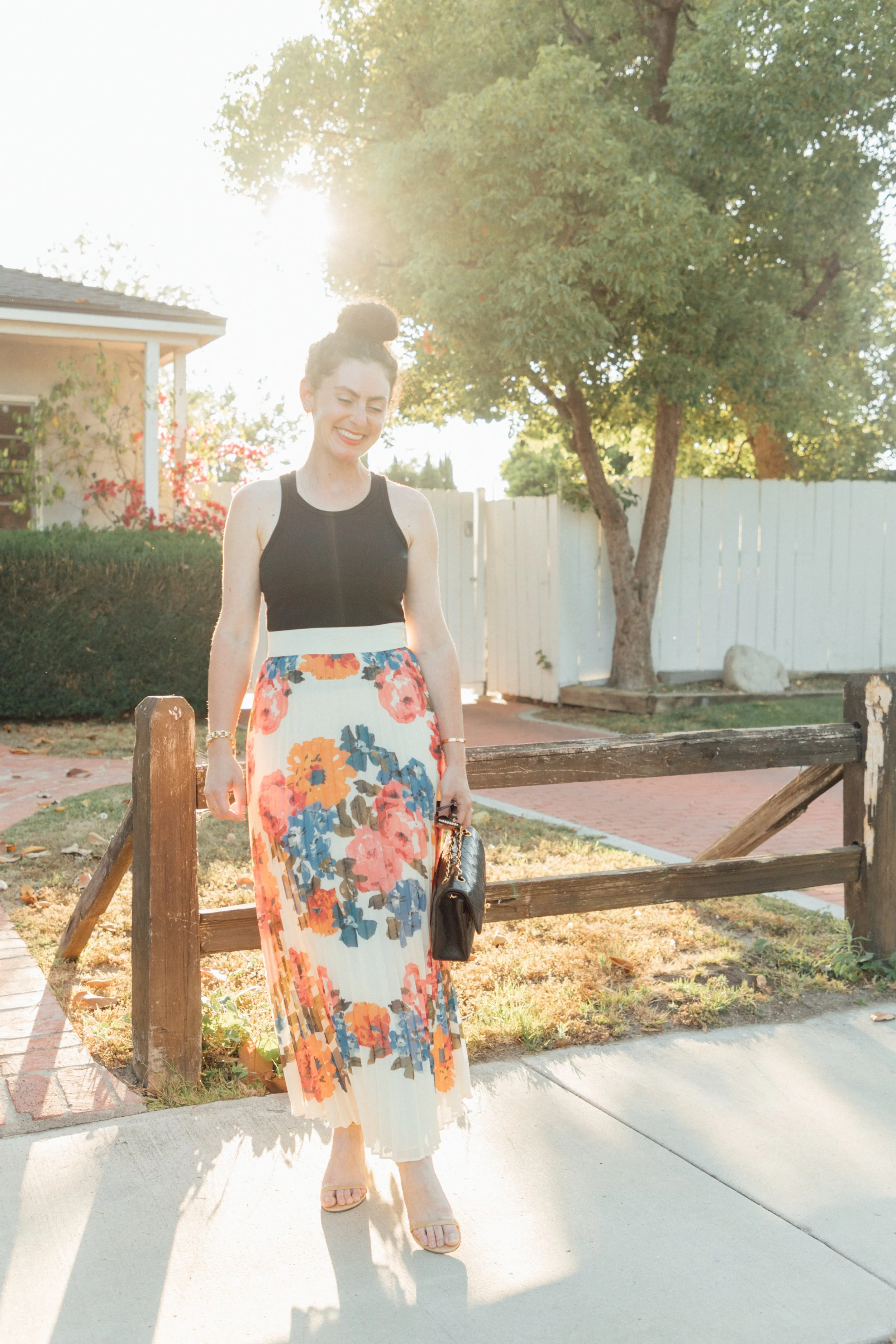 The way the light hits this floral accordion skirt makes my heart happy. It’s made of the most beautiful, silky material and I love the colors. Today, I paired this skirt with a black tank, nude sandals, a classic bag, and I layered on a denim jacket. This skirt also looks beautiful paired with a nude bodysuit or with this matching top. Linking to this outfit below, and scroll down for some other pieces in the same floral pattern that I also have my eye on.