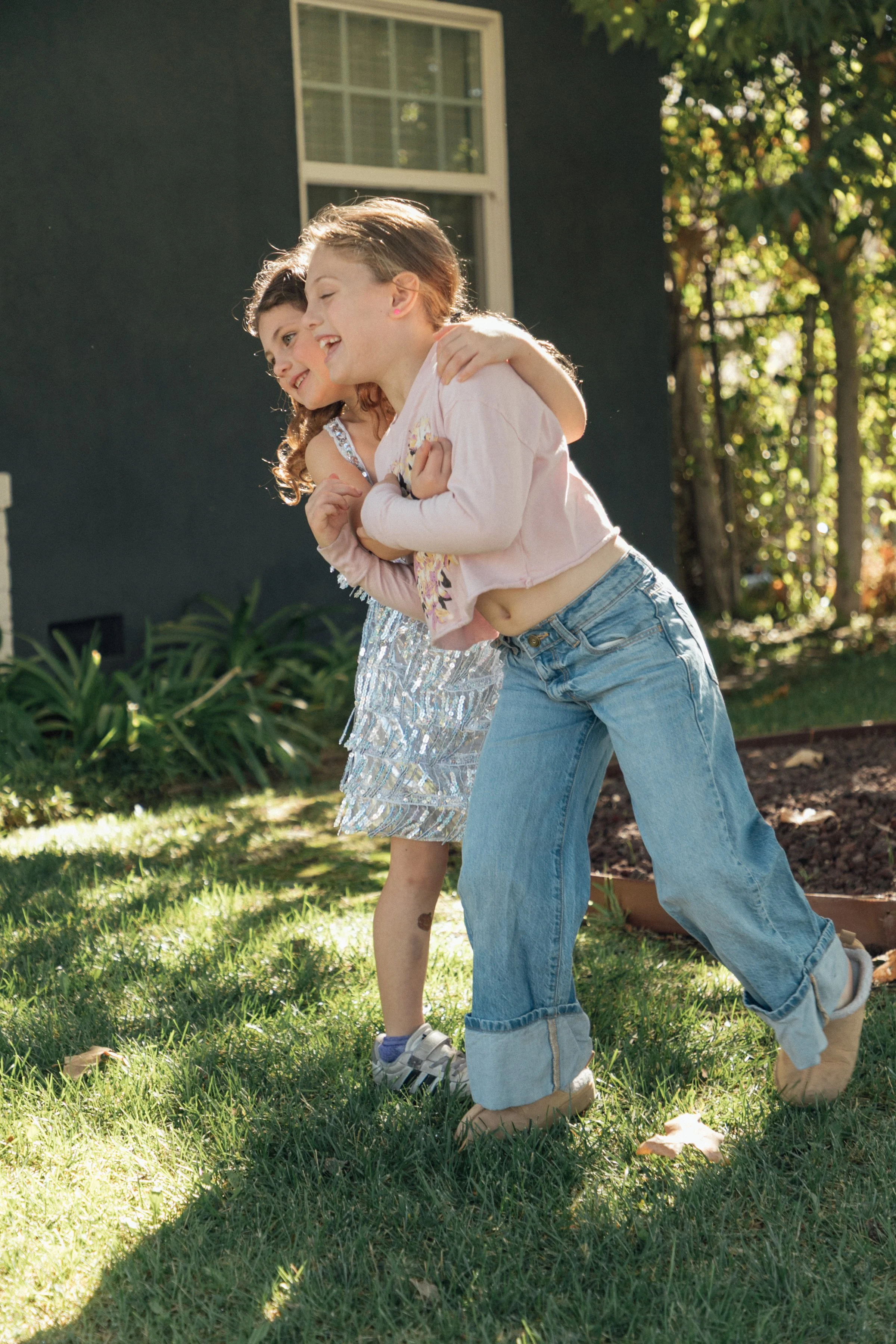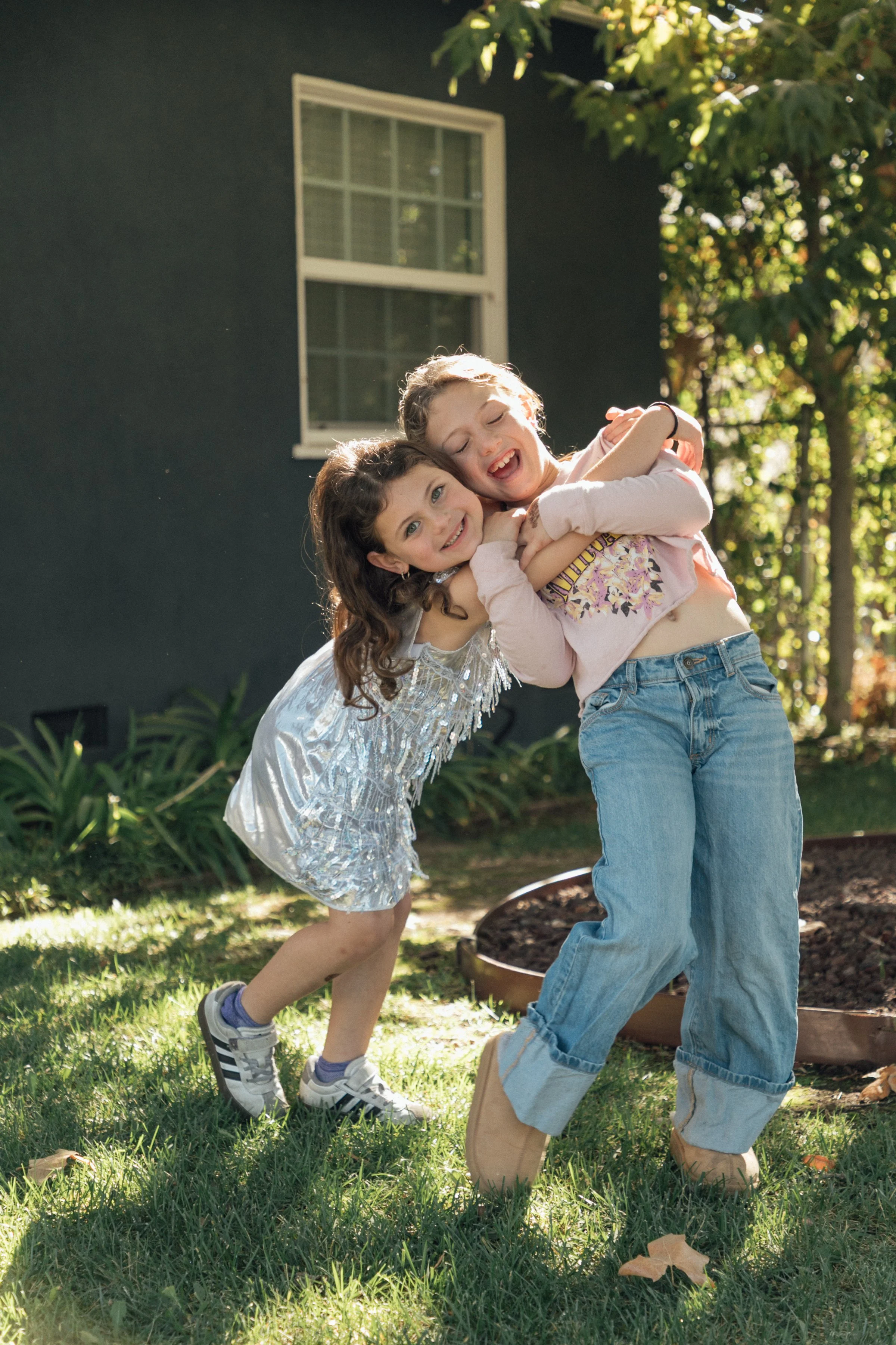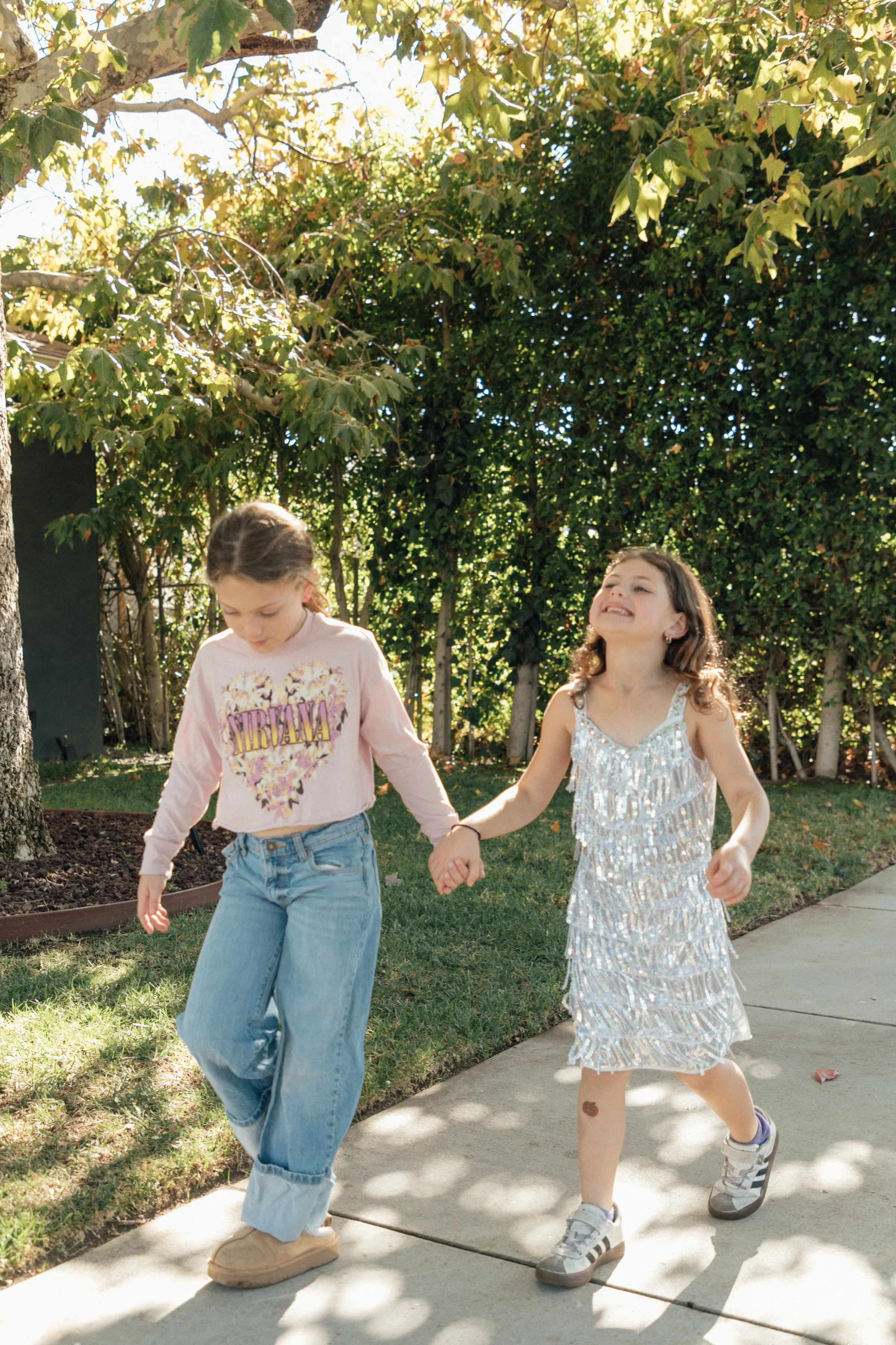 Sharing a recent Naiya and Sadie outfit of the day that I loved. I wouldn’t have necessarily picked these looks out myself but they’re so cute together. Sadie got this sparkly silver dress for her 6th birthday late last year and it’s become a big-time fave. She loves wearing her comfy adidas sneakers, and pairing them with colorful socks.