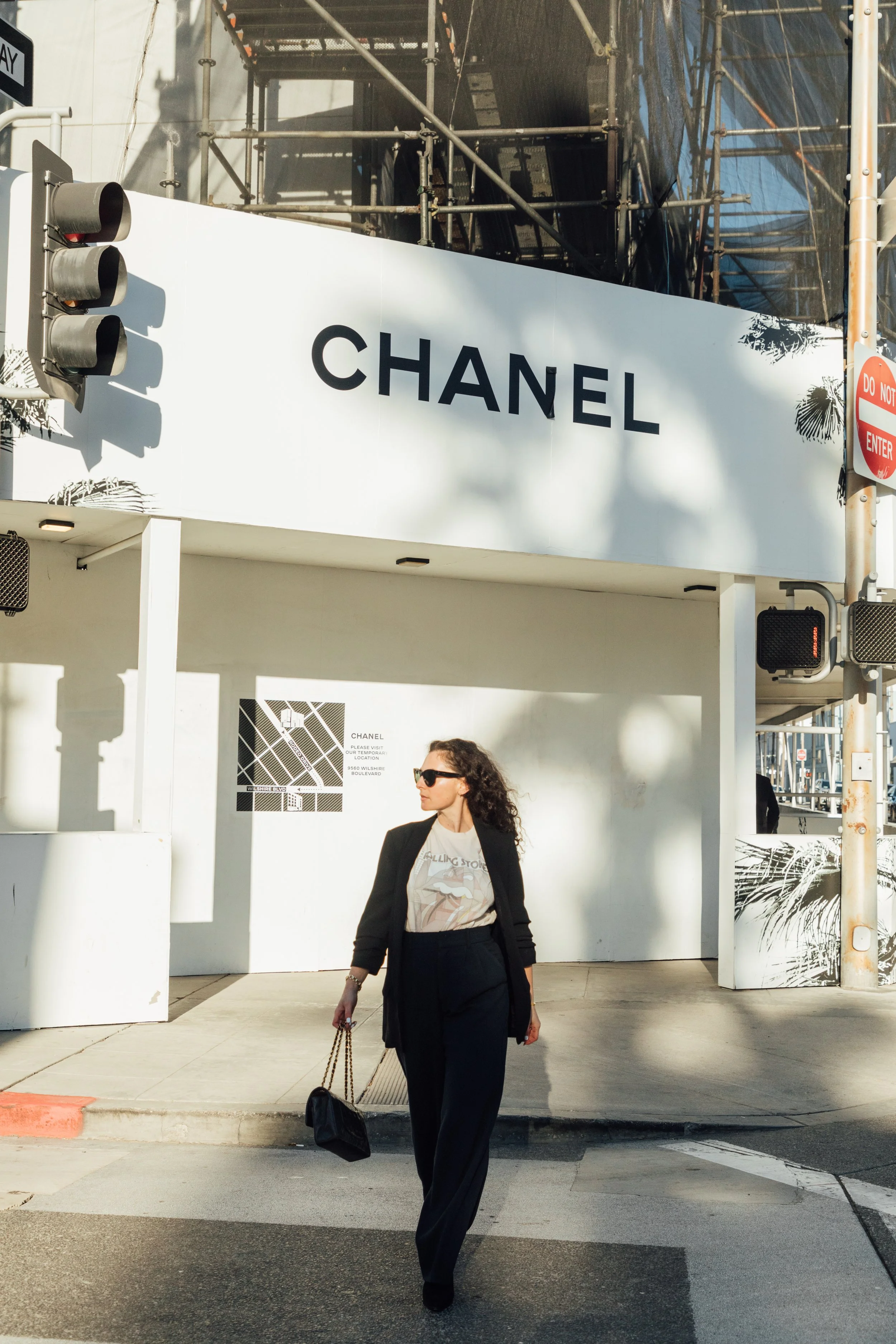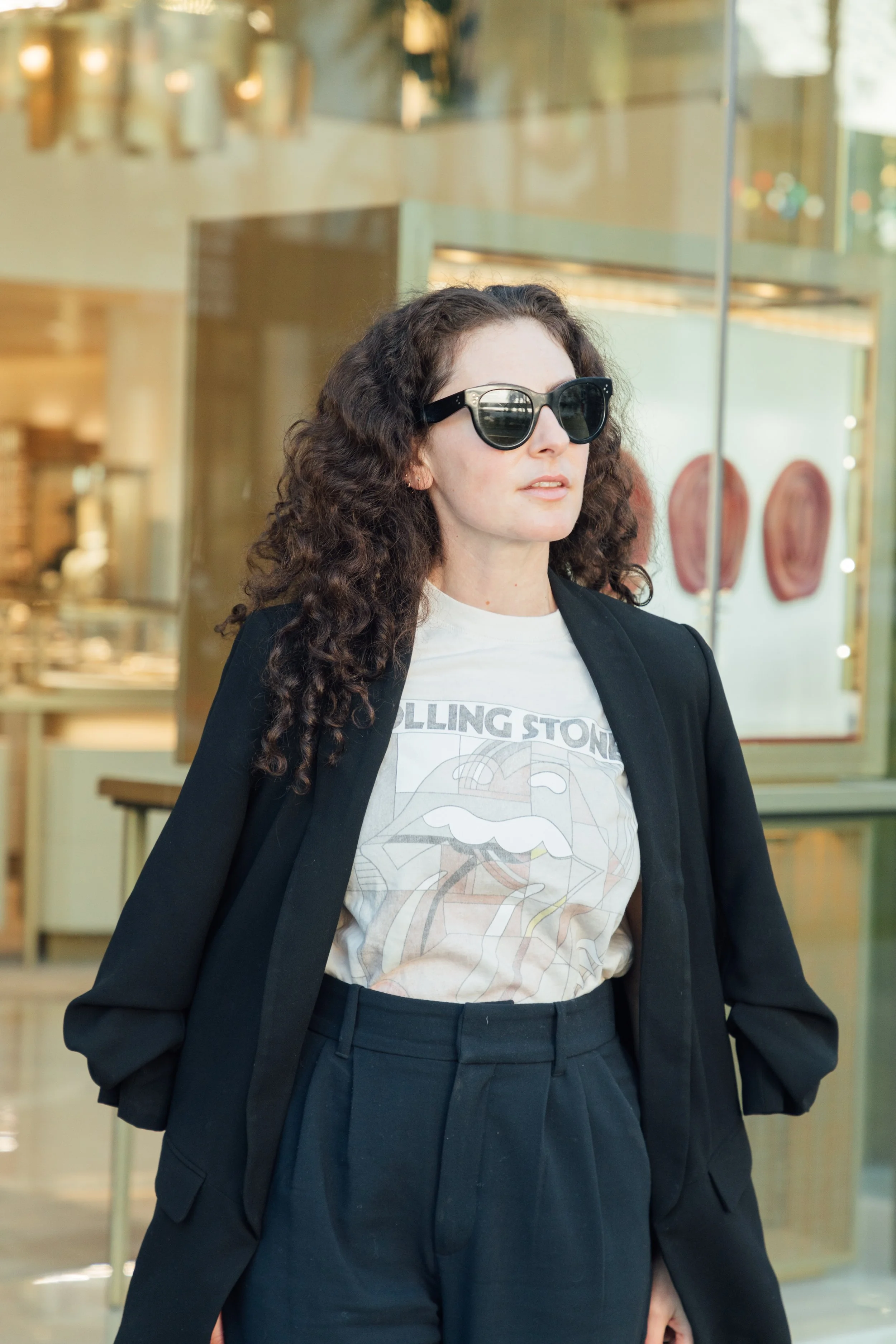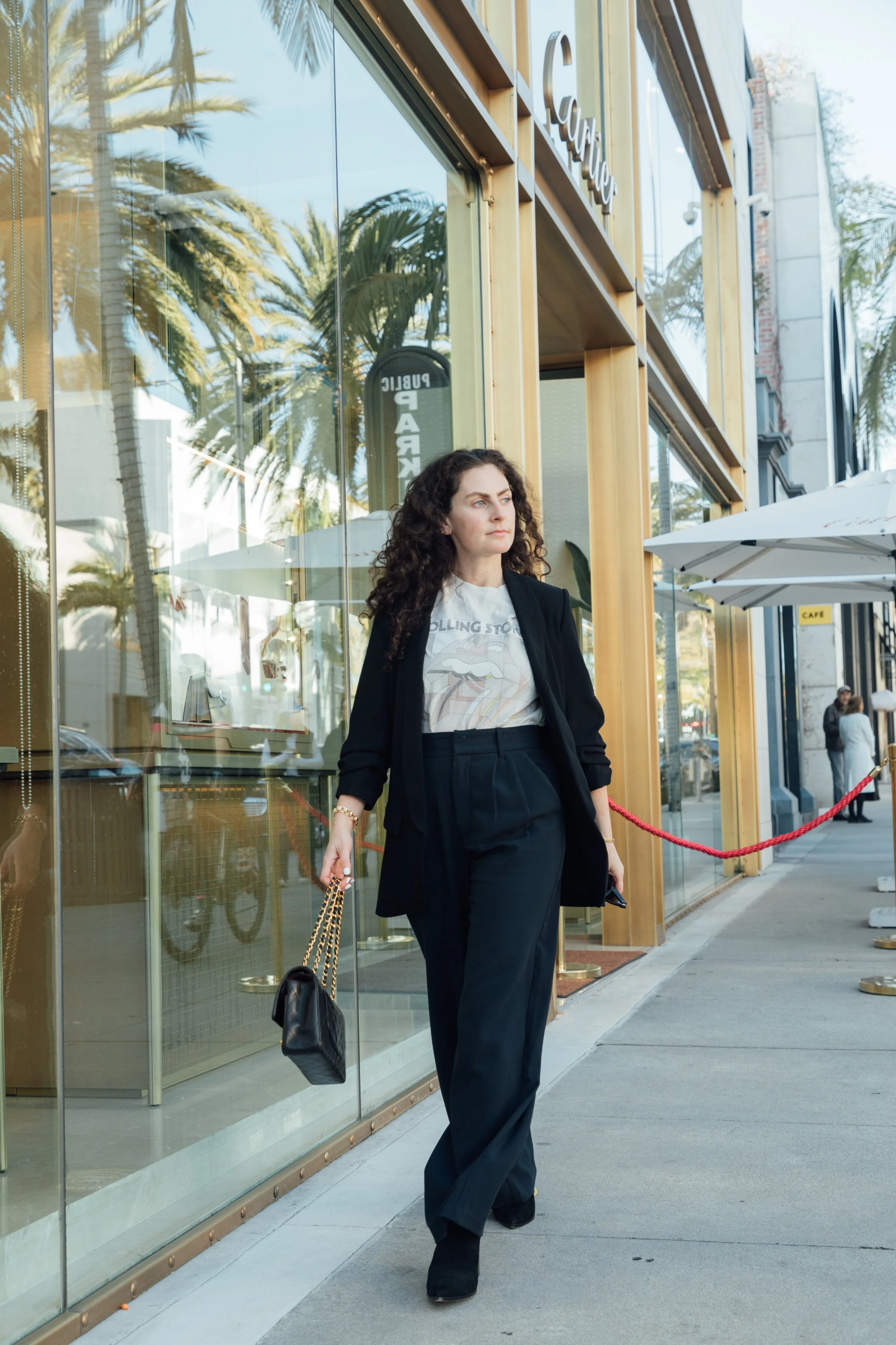 Now that our company is back in the office a few days a week, I’ve been styling a lot of suit-inspired looks with a twist. My go-to has been styling band tees with blazers and trousers. Throughout the Pandemic, these looks often sat in the back of my closet so I’ve enjoyed giving them the light of day again. Today, I paired this Rolling Stones band tee with a classic black blazer, black trousers, suede black booties, and black sunnies. Linking to outfit details below.