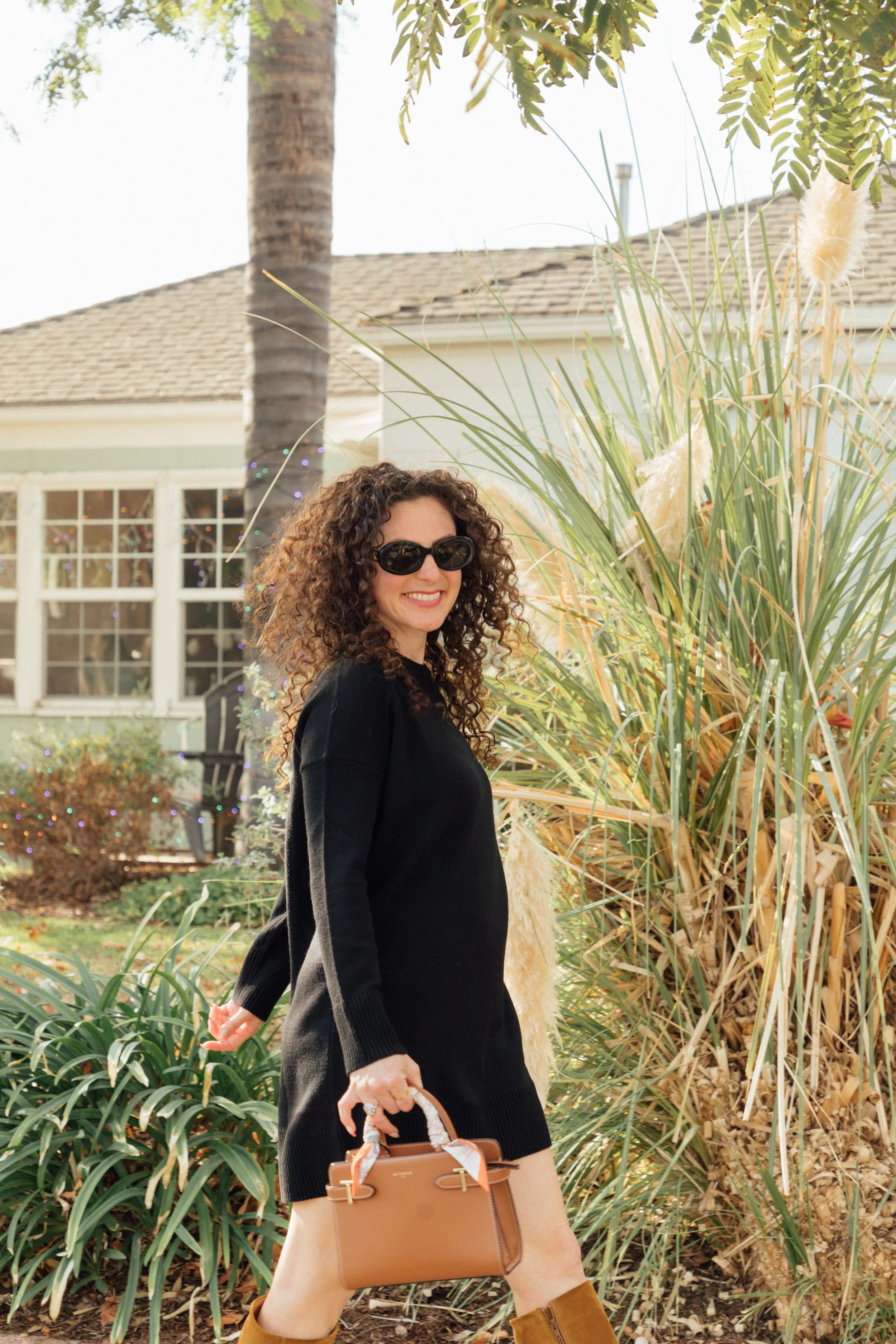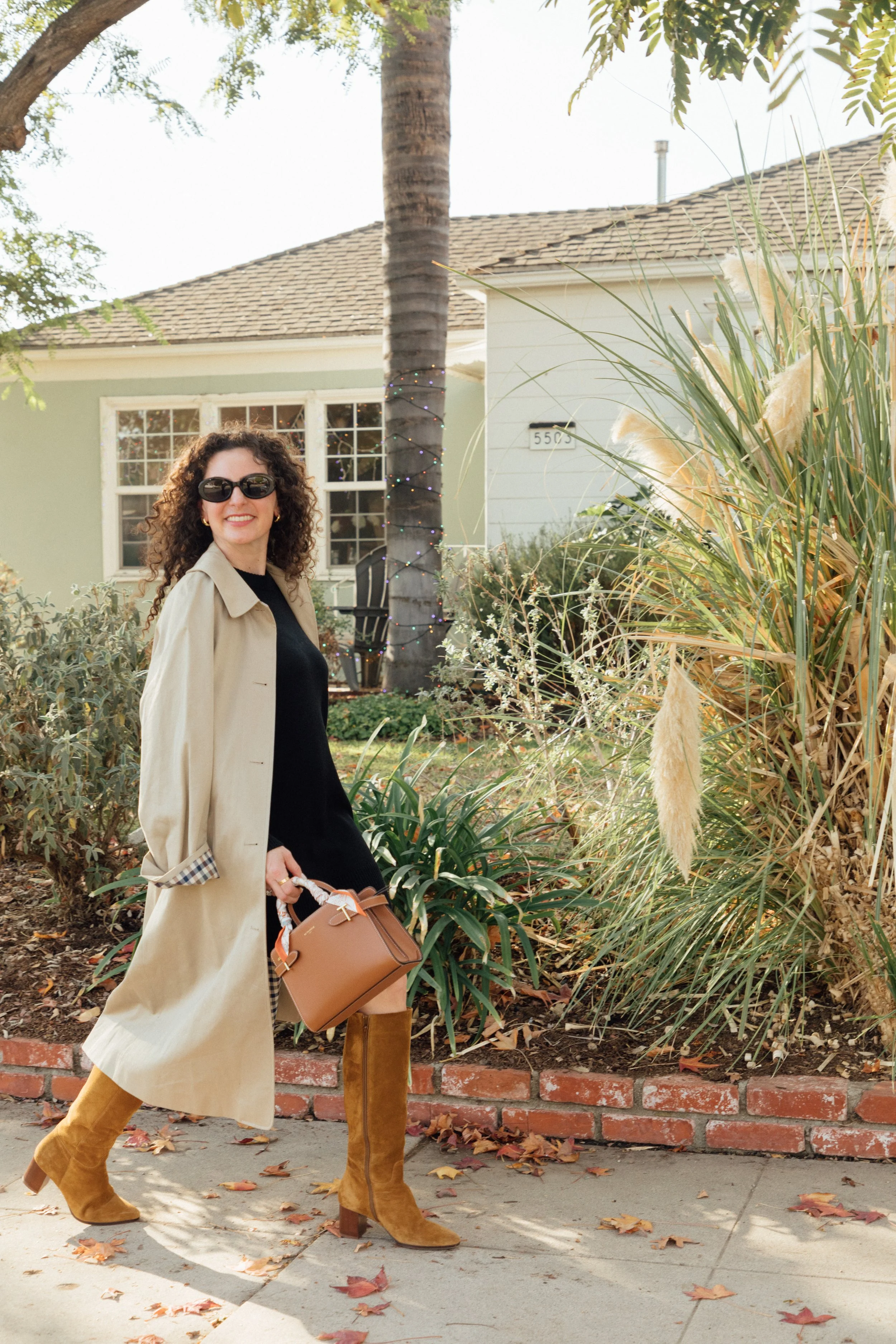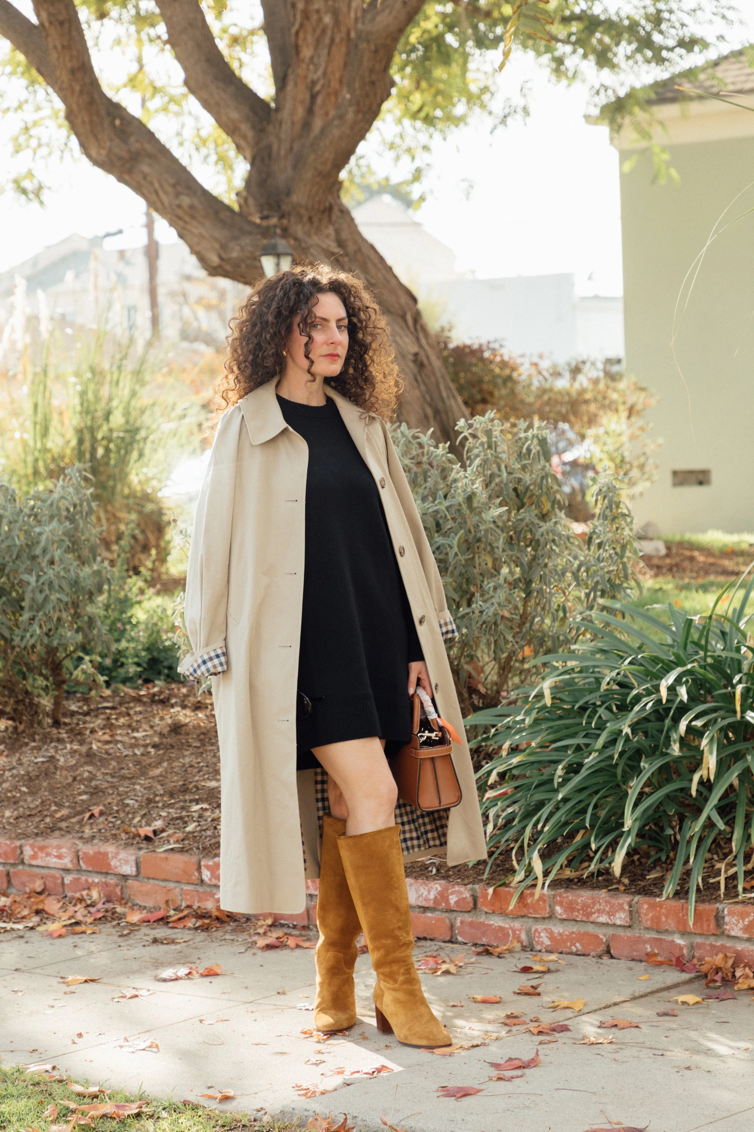 I paired one of my favorite classic trench coats with the cutest plaid material inside with suede brown boots and a comfy black sweater dress. Whenever I struggle with what to wear, this classic combo never fails and it always looks simple and chic. I topped off the look with black sunnies, a brown purse (with a twily wrapped around the handle for a pop of color), and gold statement earrings.