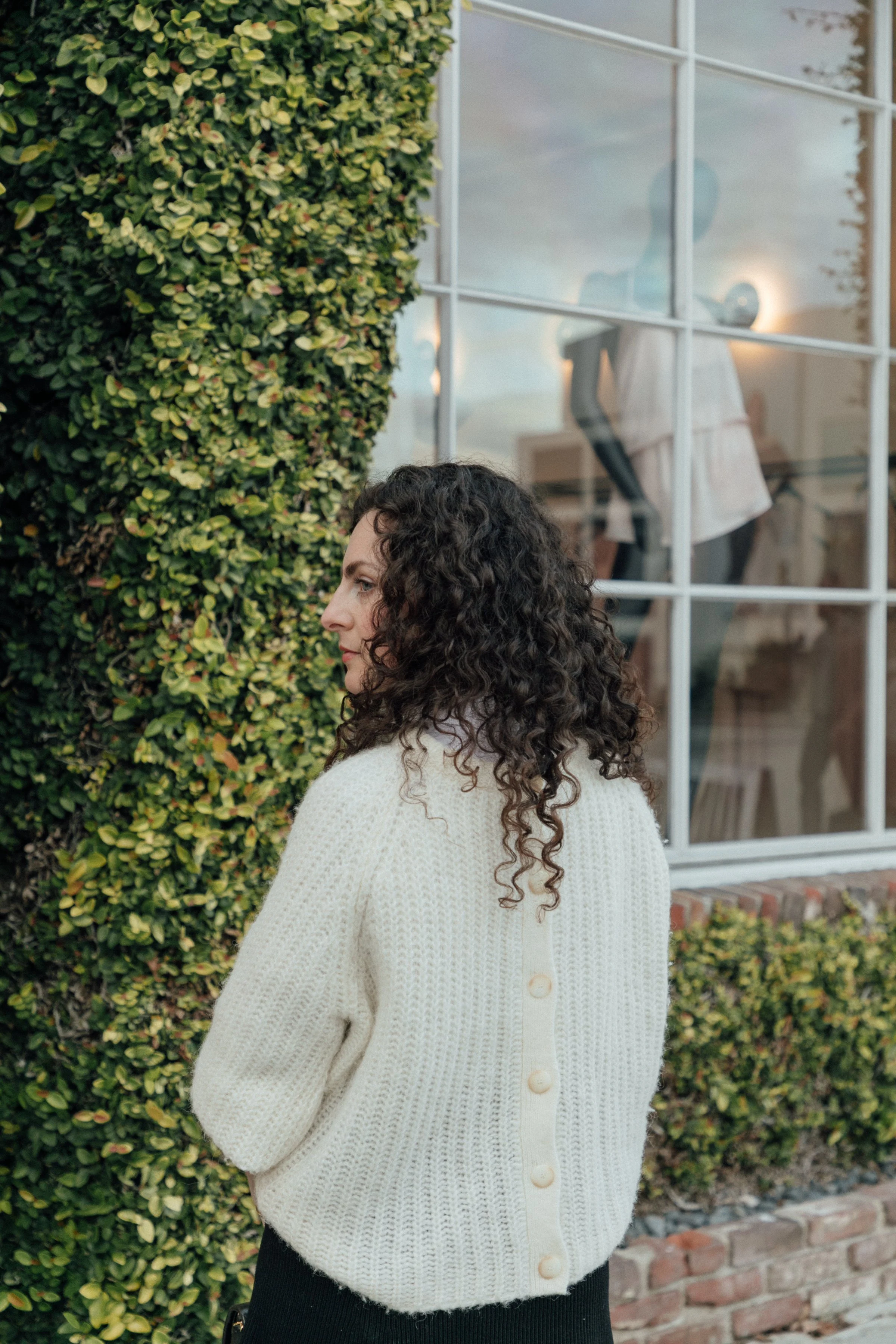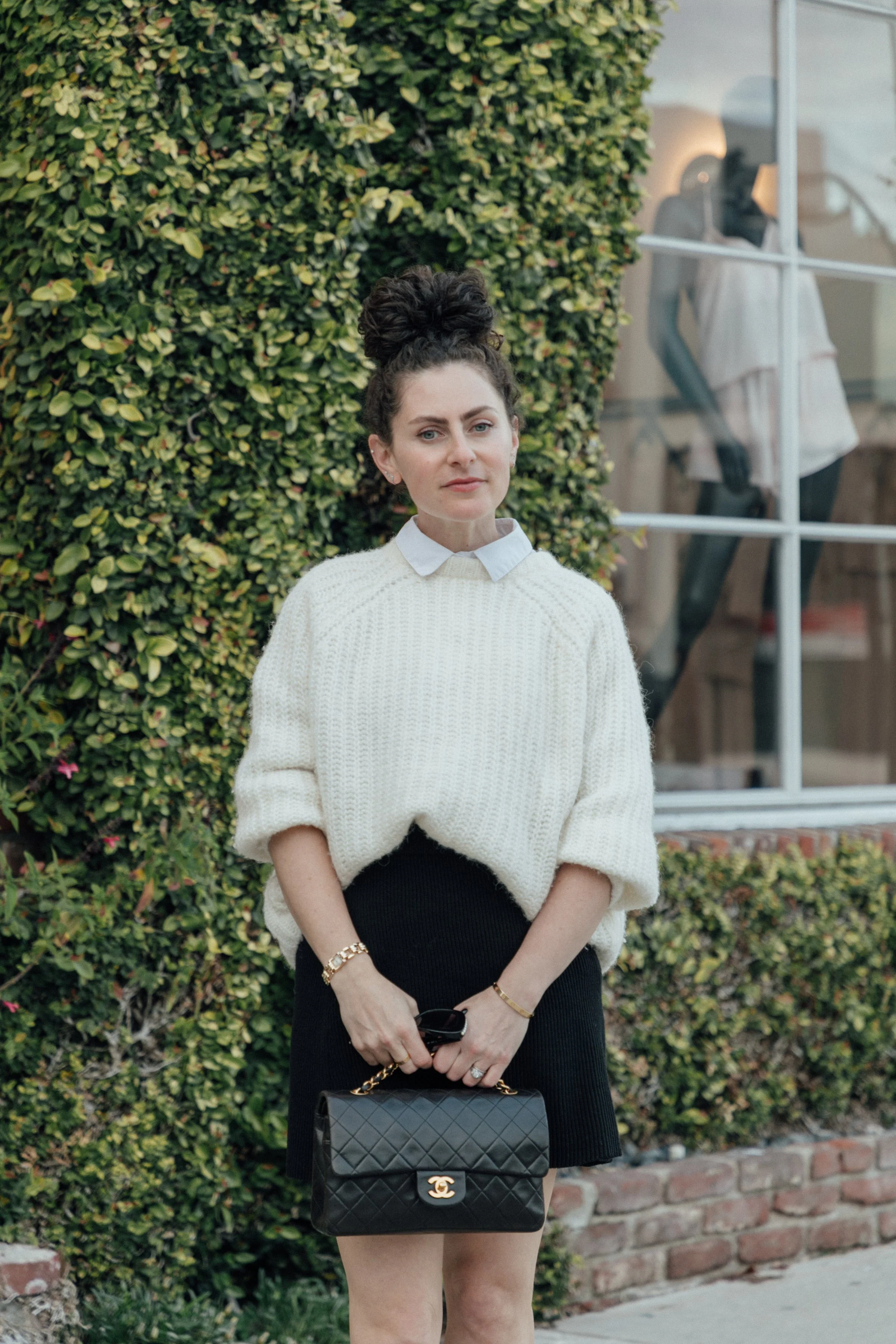 I paired my flats with a chunky white cardigan called the “Emile” which I scooped up from Sezane. I can’t rave about this sweater more. It’s reversible which gives you the best of both worlds. I often wear the sweater with the buttons down the back rather than down the front and I love both looks. It’s the perfect knit because it’s so soft, beautifully-made, and it doesn’t pill. I layered a classic white button down beneath the sweater because I love seeing the collar stick out.